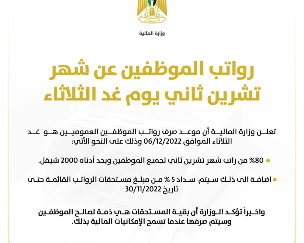 رام الله/PNN - أعلنت وزارة المالية، صرف رواتب الموظفين العموميين عن شهر نوفمبر الماضي، يوم غد الثلاثاء.
