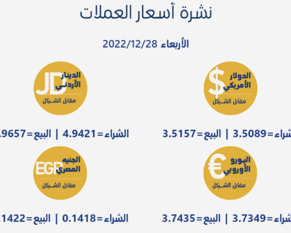 رام الله/PNN- جاءت أسعار العملات مقابل الشيقل الإسرائيلي، اليوم الاربعاء، حسب سلطة النقد، على النحو التالي: