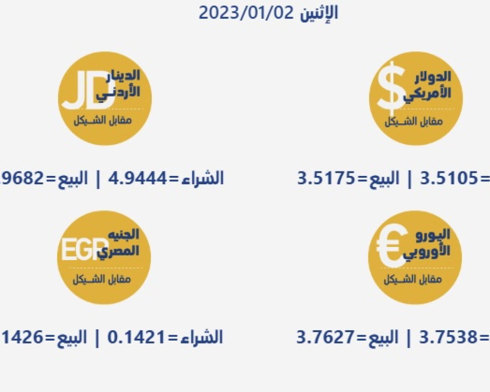 بيت لحم/PNN- جاءت أسعار العملات مقابل الشيقل الإسرائيلي، اليوم الاثنين، حسب سلطة النقد، على النحو التالي:
