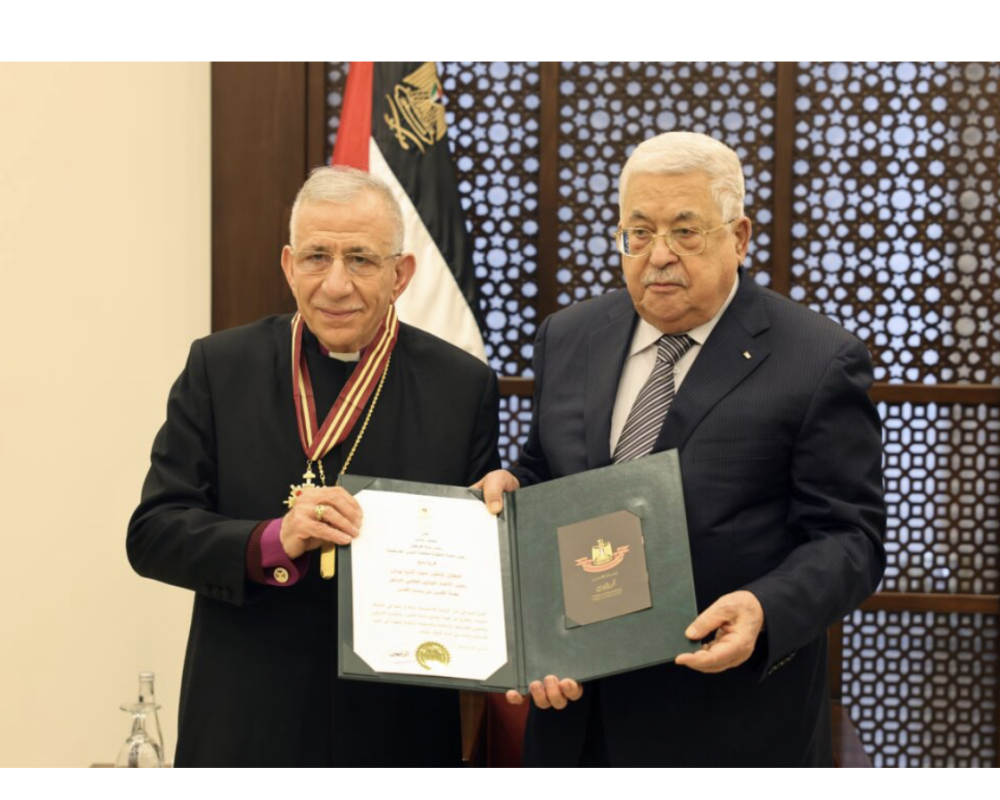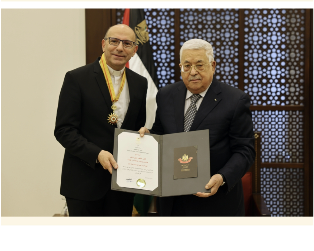 و في هذا الاطار منح رئيس دولة فلسطين محمود عباس، اليوم الجمعة، رئيس الكنيسة المشيخية في الأراضي المقدسة القس جورج حبيب عوض، نجمة بيت لحم من وسام بيت لحم.
