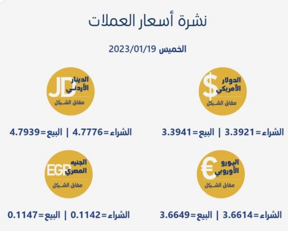رام الله/PNN- جاءت أسعار العملات مقابل الشيقل الإسرائيلي، اليوم  الخميس، حسب سلطة النقد، على النحو التالي: