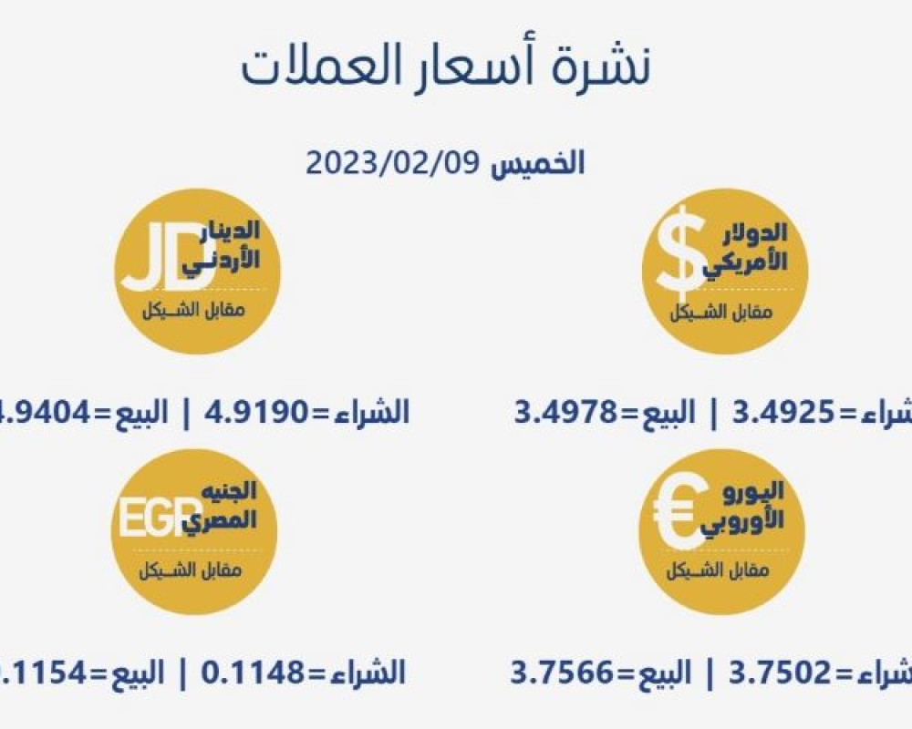 رام الله/PNN- جاءت أسعار العملات مقابل الشيقل الإسرائيلي، اليوم الخميس، حسب سلطة النقد، على النحو التالي: