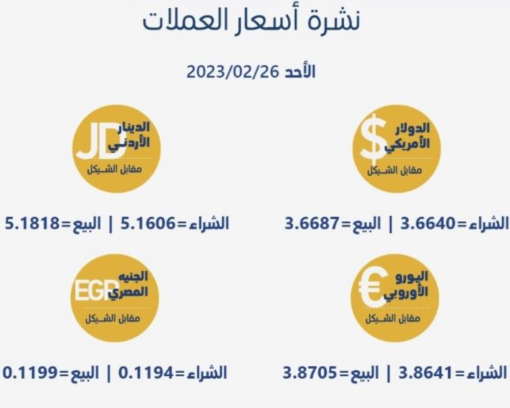 رام الله/PNN- جاءت أسعار العملات مقابل الشيقل الإسرائيلي، اليوم الأحد، حسب سلطة النقد، على النحو التالي: