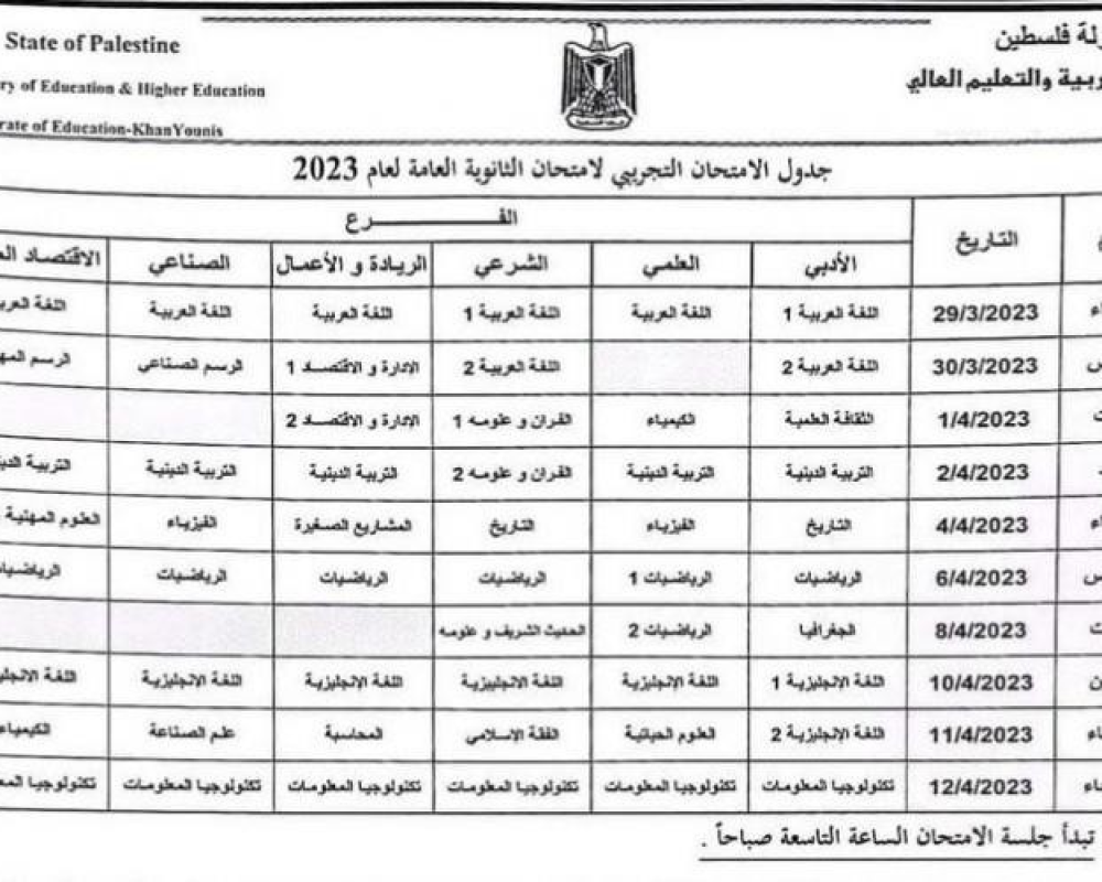 ونشرت في الإعلان، مواعيد بدء وانتهاء الامتحانات العامة، كما نشرت الوزارة ومديريات التعليم في محافظات غزة برنامج الامتحان والذي يبدأ بتاريخ 29 مارس وينتهي بتاريخ 12 أبريل 2023.