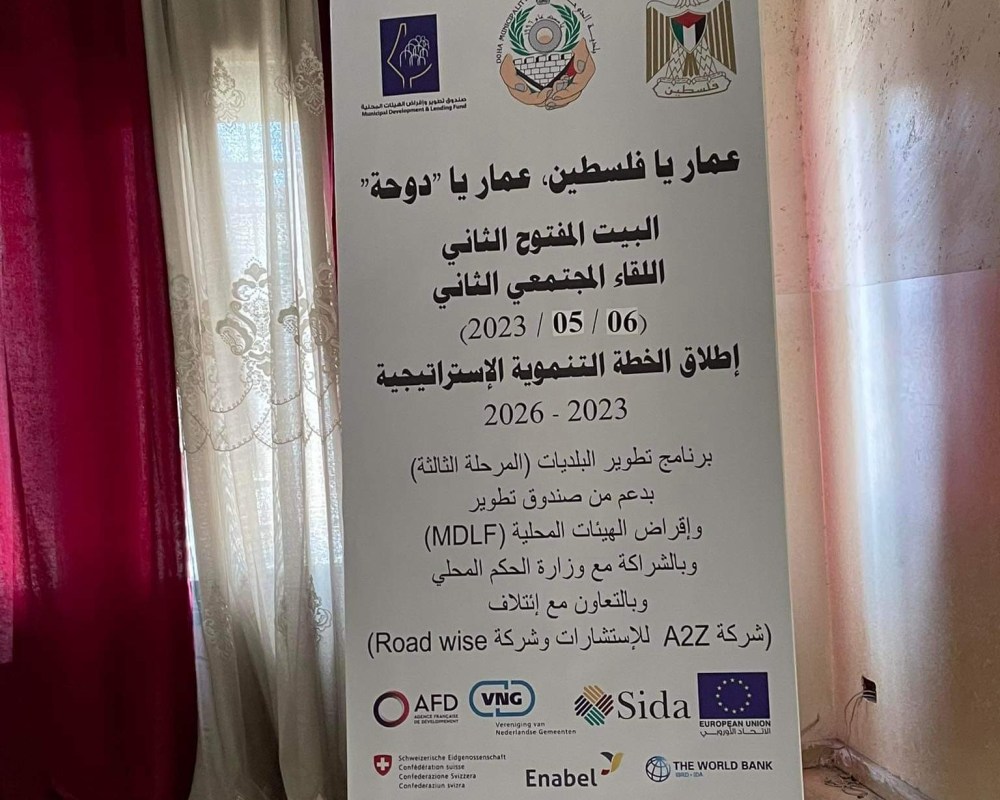بيت لحم /PNN / عقدت بلدية الدوحة اليوم السبت ٦/٥/٢٠٢٣ لقاء البيت المفتوح ونو اللقاء المجتمعي الثاني لإطلاق الخطة التنموية المحلية، وذلك ضمن برنامج تطوير البلديات - المرحلة الثالثة، وبدعم من صندوق تطوير وإقراض الهيئات المحلية وبالتعاون مع وزارة الحكم المحلي .