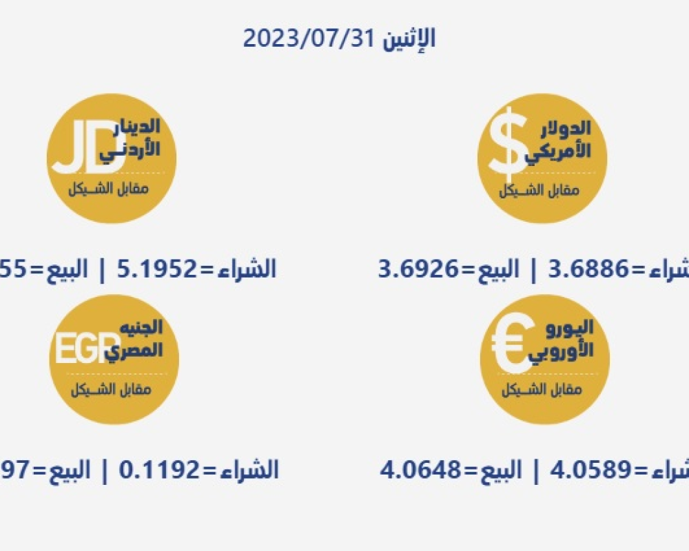 رام الله /PNN- جاءت أسعار العملات مقابل الشيقل الإسرائيلي، اليوم الإثنين، حسب سلطة النقد، على النحو التالي: