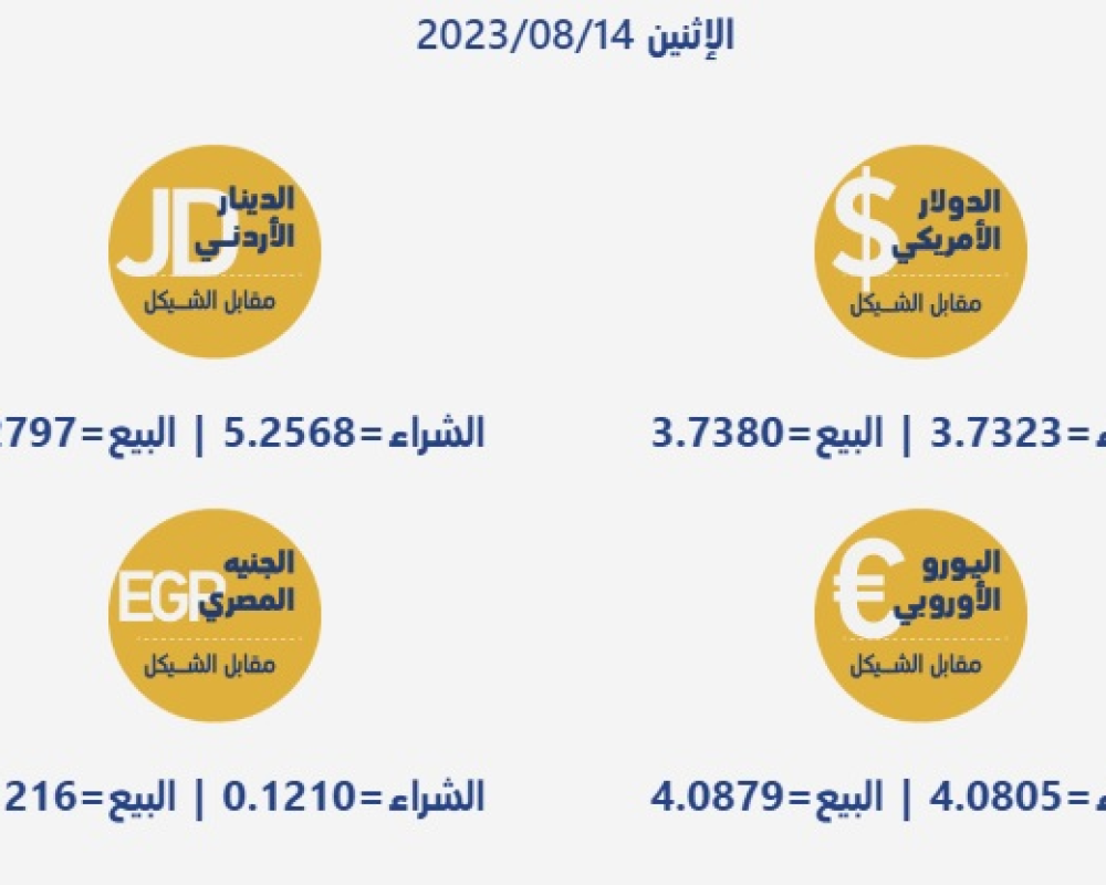 بيت لحم/PNN- جاءت أسعار العملات مقابل الشيقل الإسرائيلي، اليوم الإثنين، حسب سلطة النقد، على النحو التالي:
