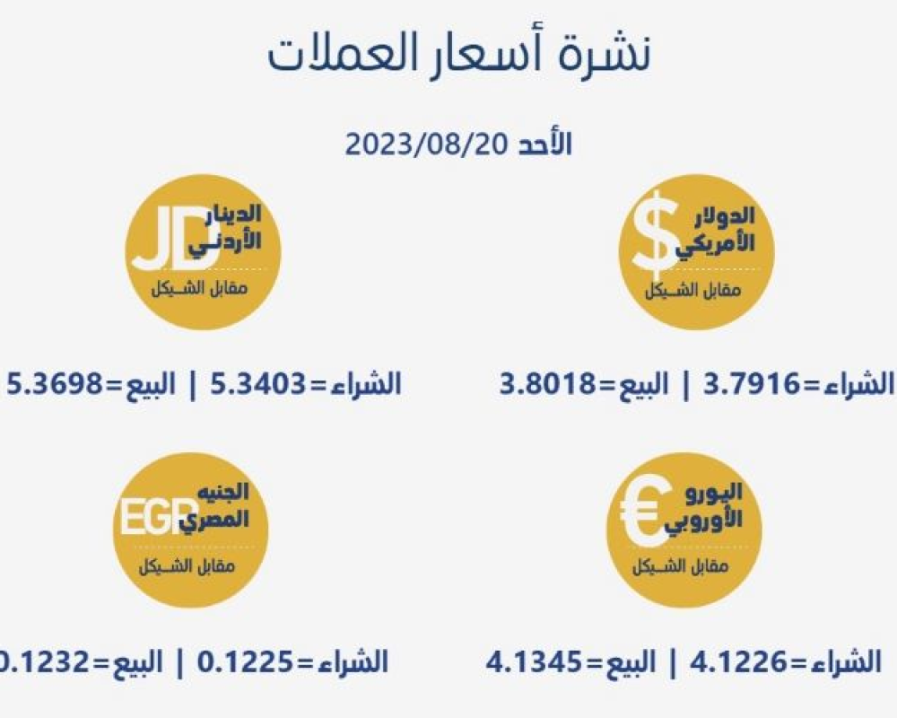 رام الله/PNN- جاءت أسعار العملات مقابل الشيقل الإسرائيلي، اليوم الأحد، حسب سلطة النقد، على النحو التالي:
