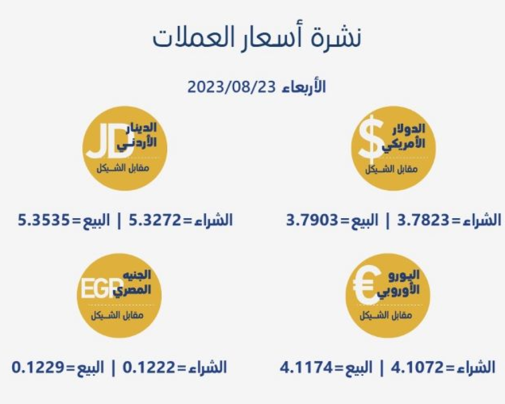 رام الله/PNN- جاءت أسعار العملات مقابل الشيقل الإسرائيلي، اليوم الأربعاء، حسب سلطة النقد، على النحو التالي: