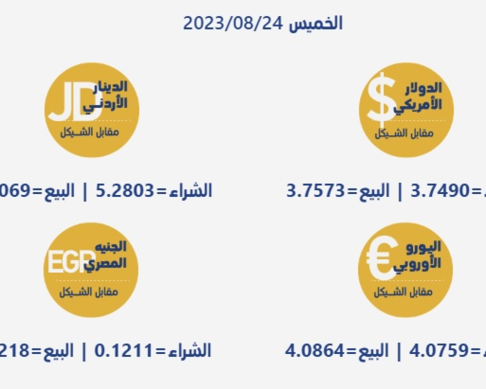 بيت لحم/PNN- جاءت أسعار العملات مقابل الشيقل الإسرائيلي، اليوم الخميس، حسب سلطة النقد، على النحو التالي: