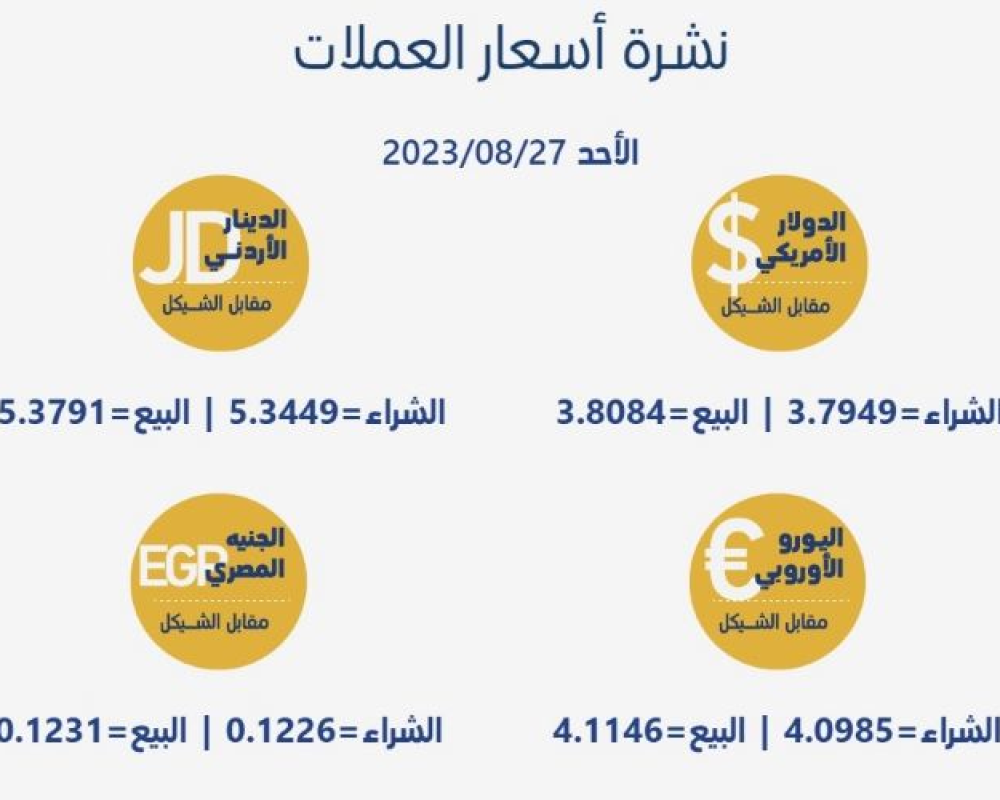 رام الله/PNN- جاءت أسعار العملات مقابل الشيقل الإسرائيلي، اليوم الأحد، حسب سلطة النقد، على النحو التالي: