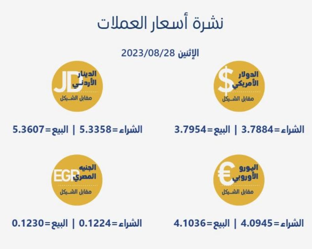رام الله /PNN- جاءت أسعار العملات مقابل الشيقل الإسرائيلي، اليوم الإثنين، حسب سلطة النقد، على النحو التالي: