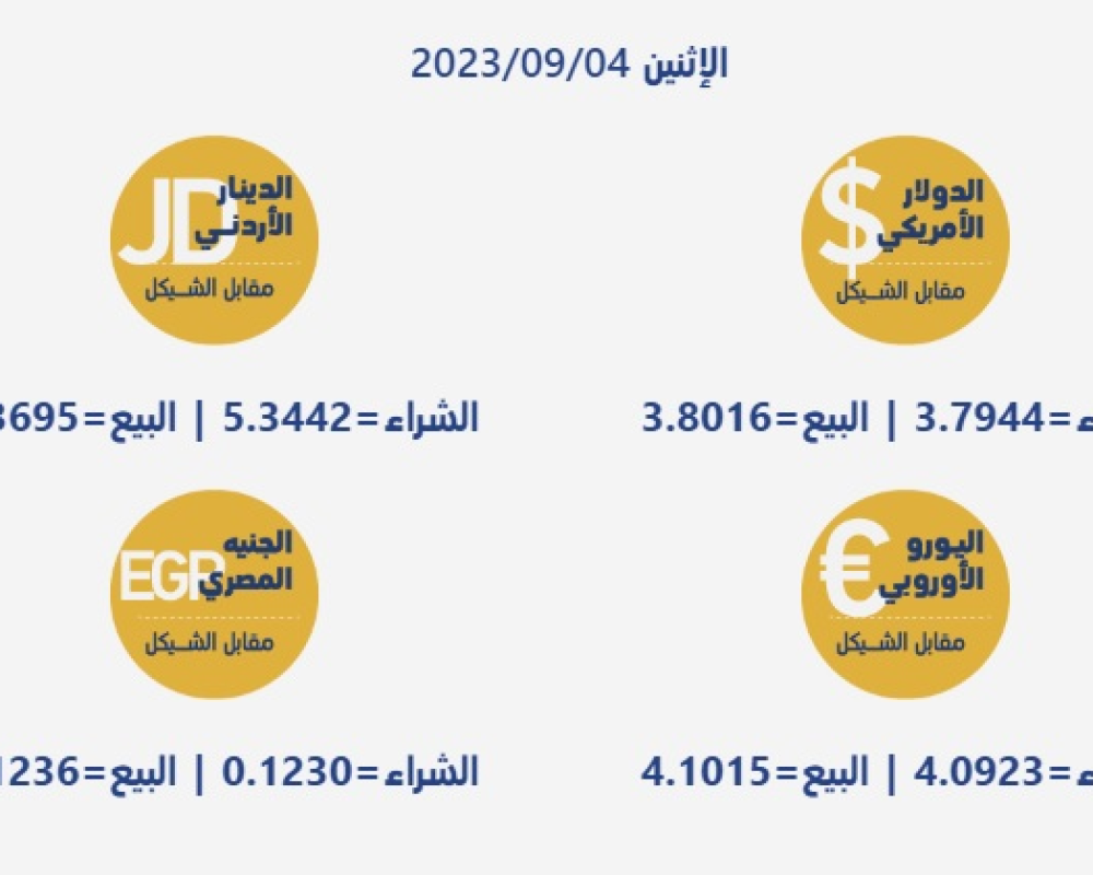 رام الله/PNN- جاءت أسعار العملات مقابل الشيقل الإسرائيلي، اليوم الإثنين، حسب سلطة النقد، على النحو التالي: