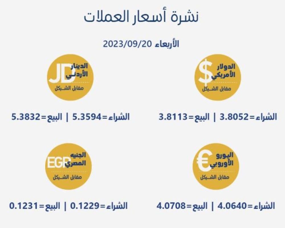 رام الله/PNN- جاءت أسعار العملات مقابل الشيقل الإسرائيلي، اليوم الأربعاء، حسب سلطة النقد، على النحو التالي:
