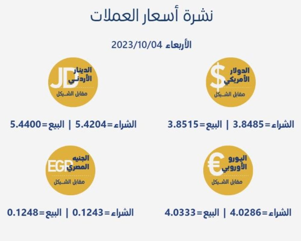 رام الله/PNN- جاءت أسعار العملات مقابل الشيقل الإسرائيلي، اليوم الأربعاء، حسب سلطة النقد، على النحو التالي: