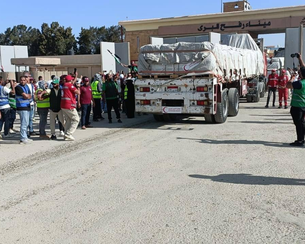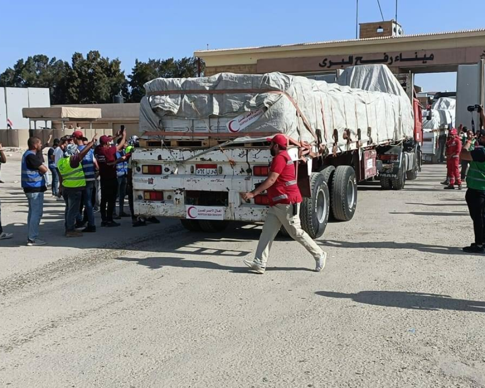 وحسب الهلال الأحمر، فقد ضمت القافلة الإغاثية الأولى 20 شاحنة، وتمر تباعا من معبر رفح حاليا.