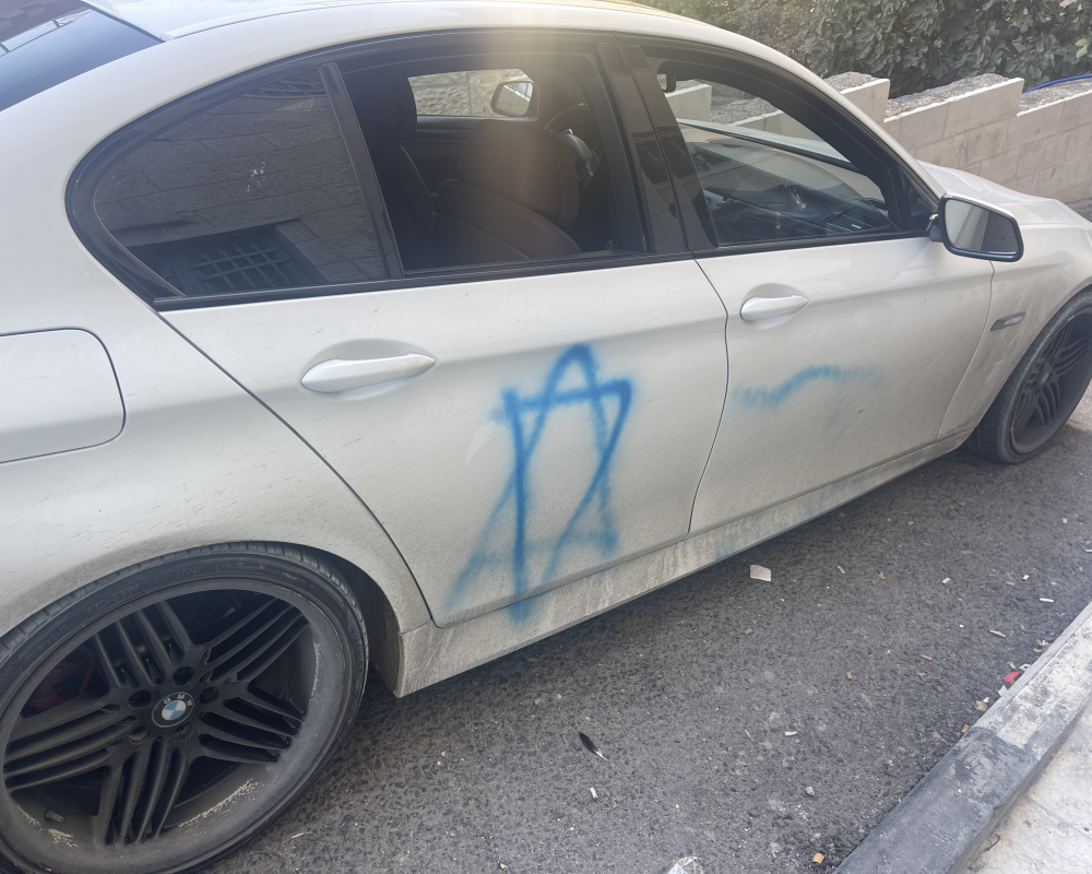 وقال ان احد المستوطنين قام برش نجمة داوود على السيارة حيث اكتشف ذلك بعد فراره من بين المستوطنين.