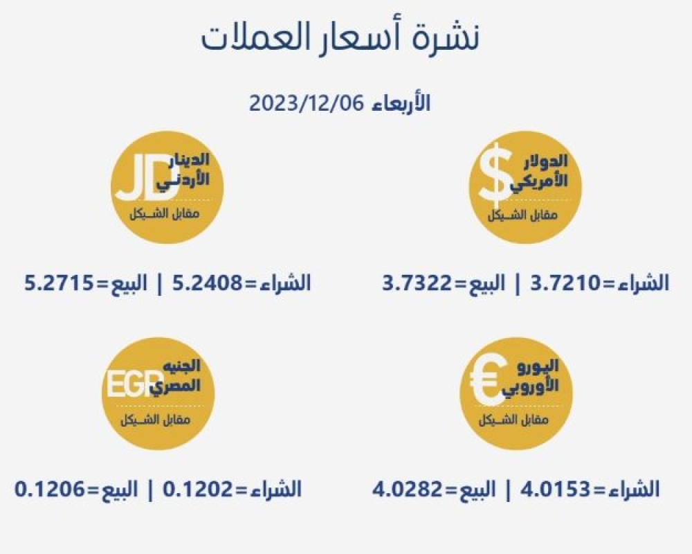 رام الله/PNN- جاءت أسعار صرف العملات مقابل الشيقل الإسرائيلي، اليوم الأربعاء، بحسب سلطة النقد الفلسطينية، على النحو التالي: