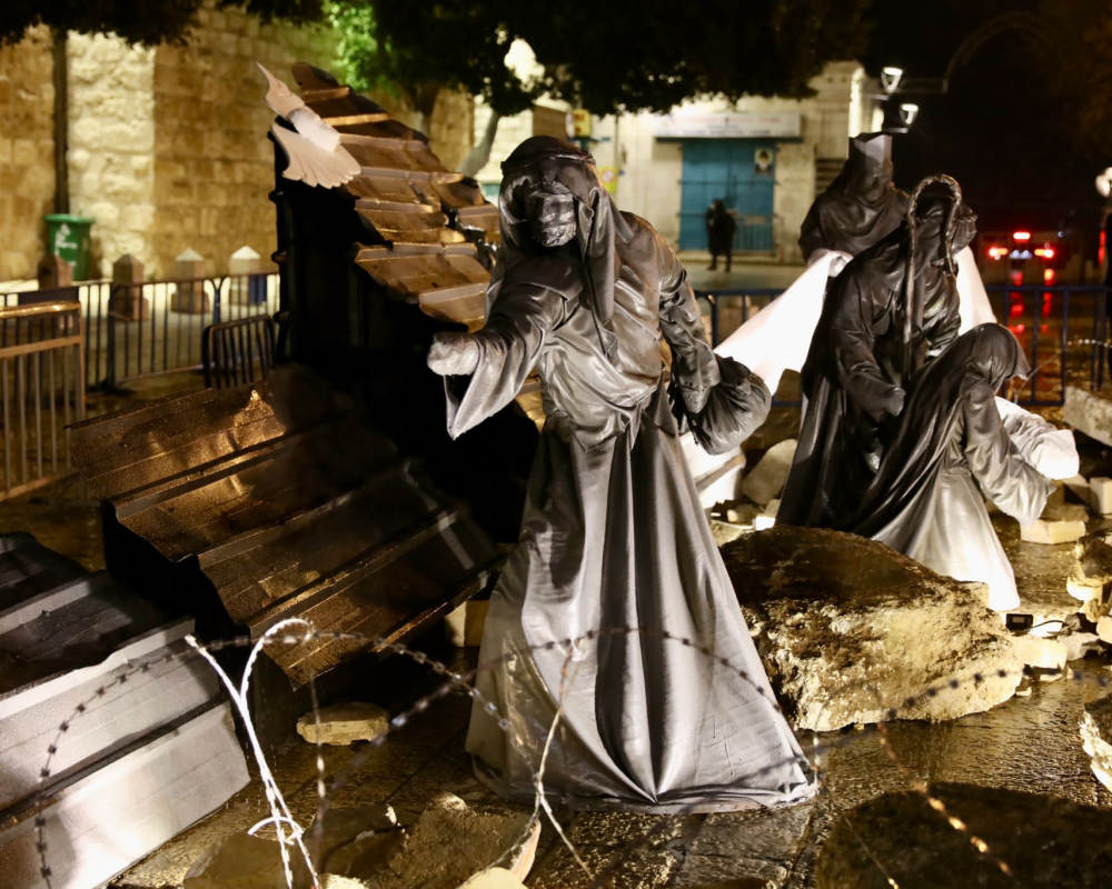 وقال رئيس بلدية بيت لحم حنا حنانيا "هنا غزة حاضرة، فالمغارة ليسَت عادية فهي مدّمرة بفعل القصف، بينَ جدرانِها تحتضن العائلة المقدسة من خلال شكلها الذي يماثلُ خارطة غزة، والأطفال الّذين ارتقوا شهداء كالملائكة تنظر من السماء، وضوء المغارةِ هنا خافت جداً بسبب القصف والموت، وفي الوسط تحتضن مريم العذراء الطفل يسوع، مُعلَنةً الحياة الجديدة للبشريةِ جمعاء.