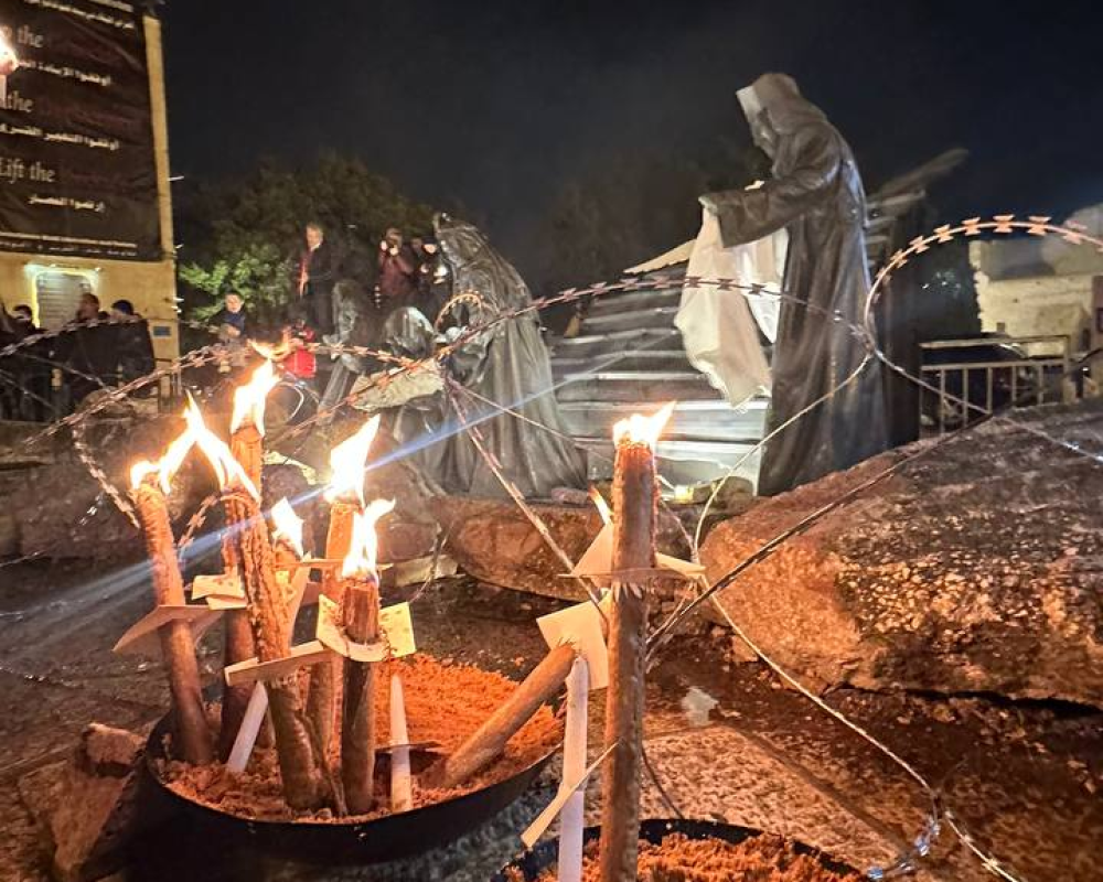 وتم افتتاح المغارة بصلاة من أجل السلام في فلسطين حيث تم اضاءة شموع من قبل الحضور بمصاحبة اغنية سلام لغزة تلاها تدشين المغارة.