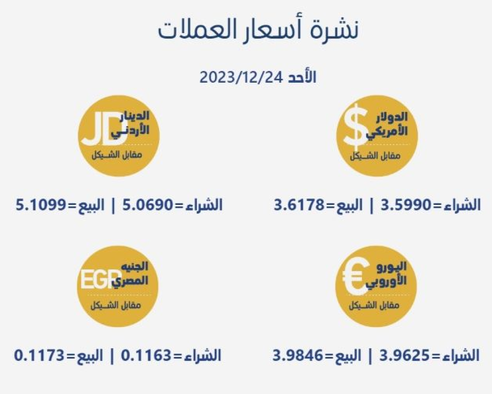 رام الله/PNN- جاءت أسعار صرف العملات مقابل الشيقل الإسرائيلي، اليوم الأحد، بحسب سلطة النقد الفلسطينية، على النحو التالي:
