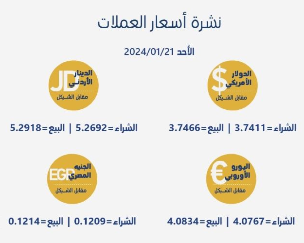 رام الله/PNN- - جاءت أسعار صرف العملات مقابل الشيقل الإسرائيلي، اليوم الأحد، بحسب سلطة النقد الفلسطينية، على النحو التالي: