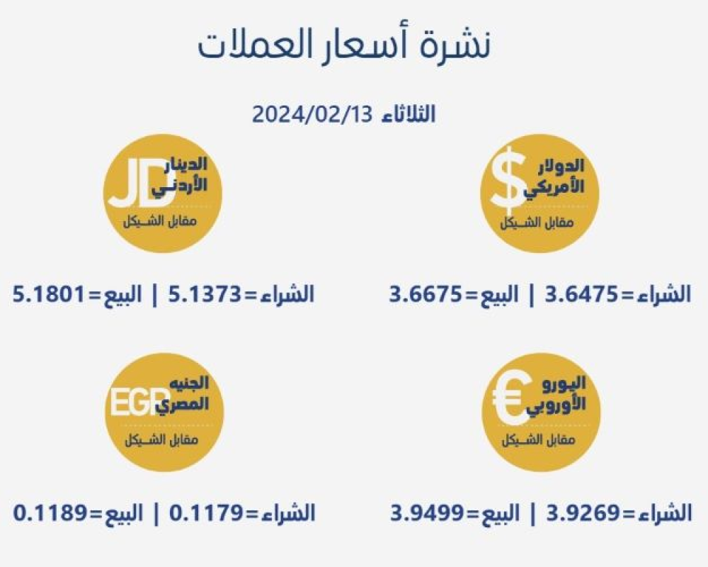 بيت لحم/PNN-جاءت أسعار صرف العملات مقابل الشيقل الإسرائيلي، اليوم الثلاثاء، بحسب سلطة النقد الفلسطينية، على النحو التالي: