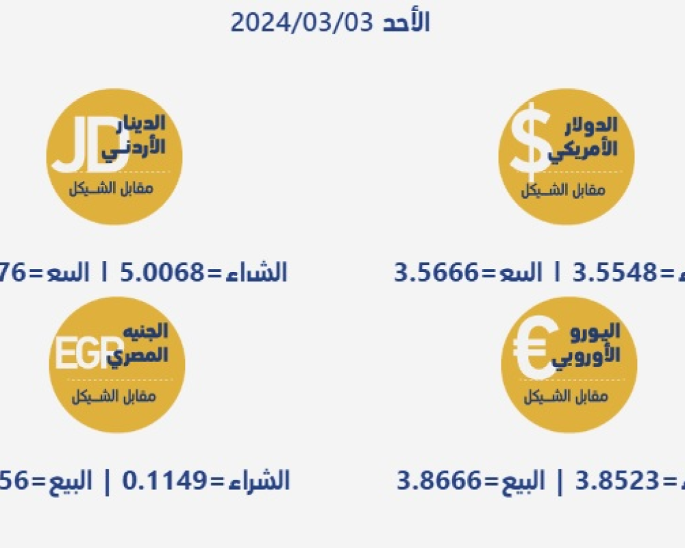 رام الله/PNN- جاءت أسعار صرف العملات مقابل الشيقل الإسرائيلي، اليوم الأحد، بحسب سلطة النقد الفلسطينية، على النحو التالي: