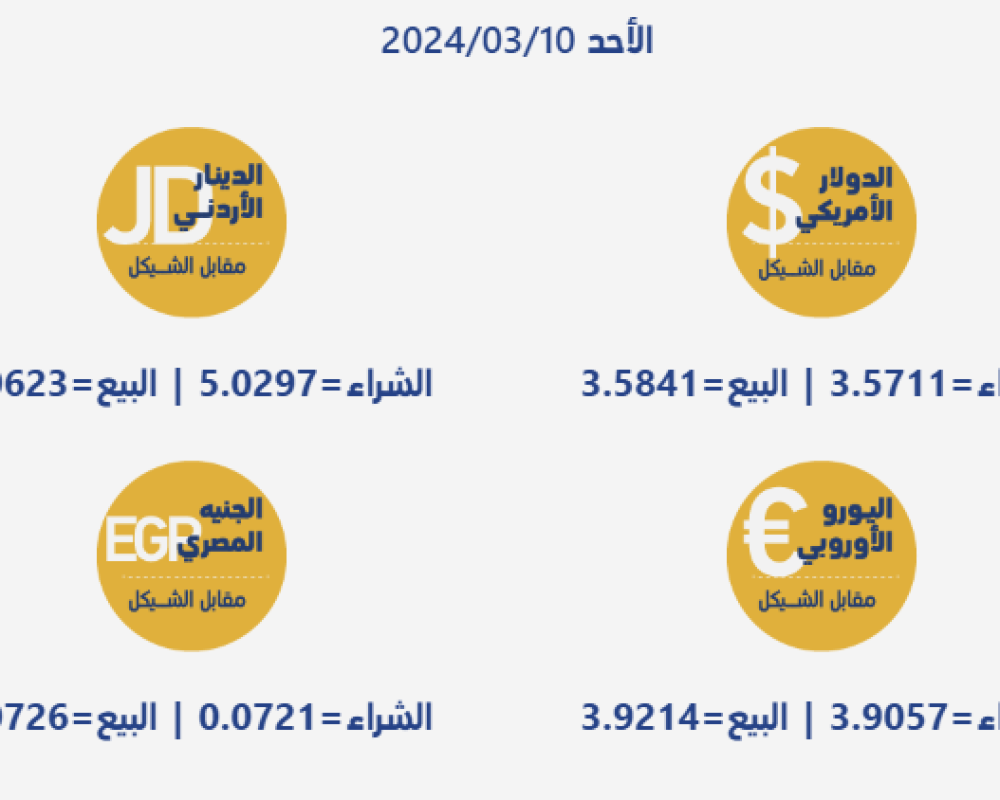 رام الله/PNN- جاءت أسعار صرف العملات مقابل الشيقل الإسرائيلي، اليوم الأحد، بحسب سلطة النقد الفلسطينية، على النحو التالي: