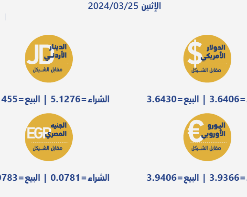 رام الله/PNN- جاءت أسعار صرف العملات مقابل الشيقل الإسرائيلي، اليوم الإثنين، بحسب سلطة النقد الفلسطينية، على النحو التالي: