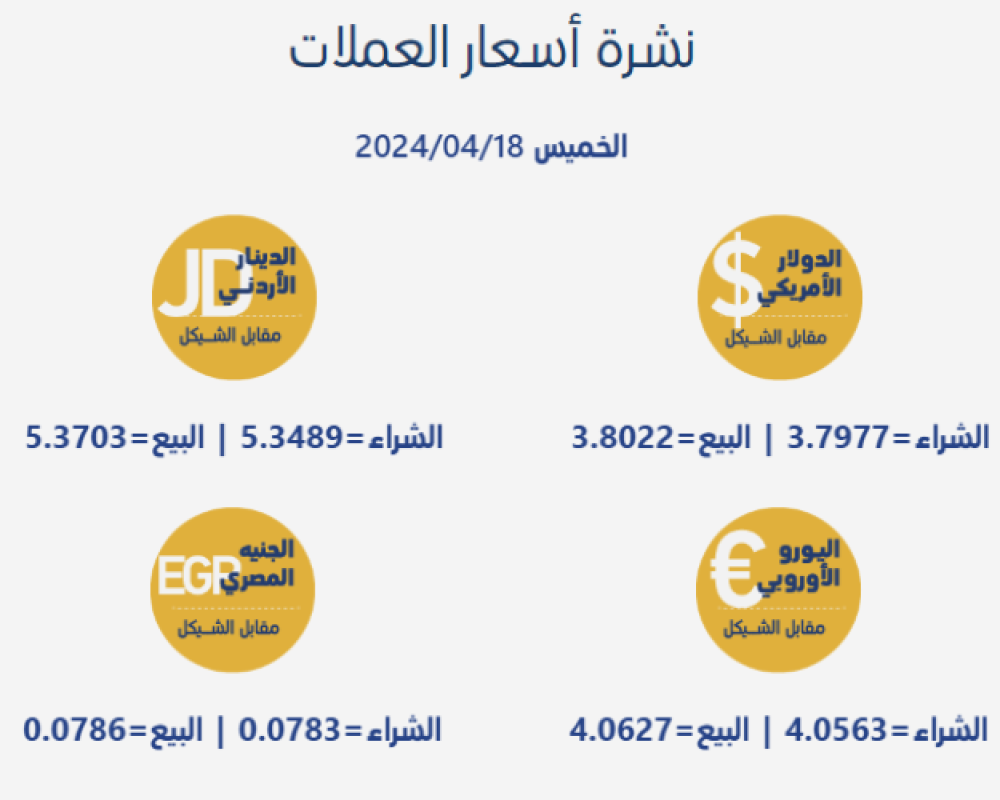 رام الله/PNN- جاءت أسعار صرف العملات مقابل الشيقل الإسرائيلي، اليوم الخميس، بحسب سلطة النقد الفلسطينية، على النحو التالي: