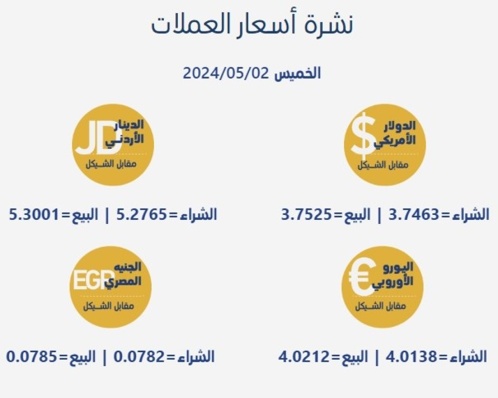 رام الله/PNN- جاءت أسعار صرف العملات مقابل الشيقل الإسرائيلي، اليوم الخميس، بحسب سلطة النقد الفلسطينية، على النحو التالي: