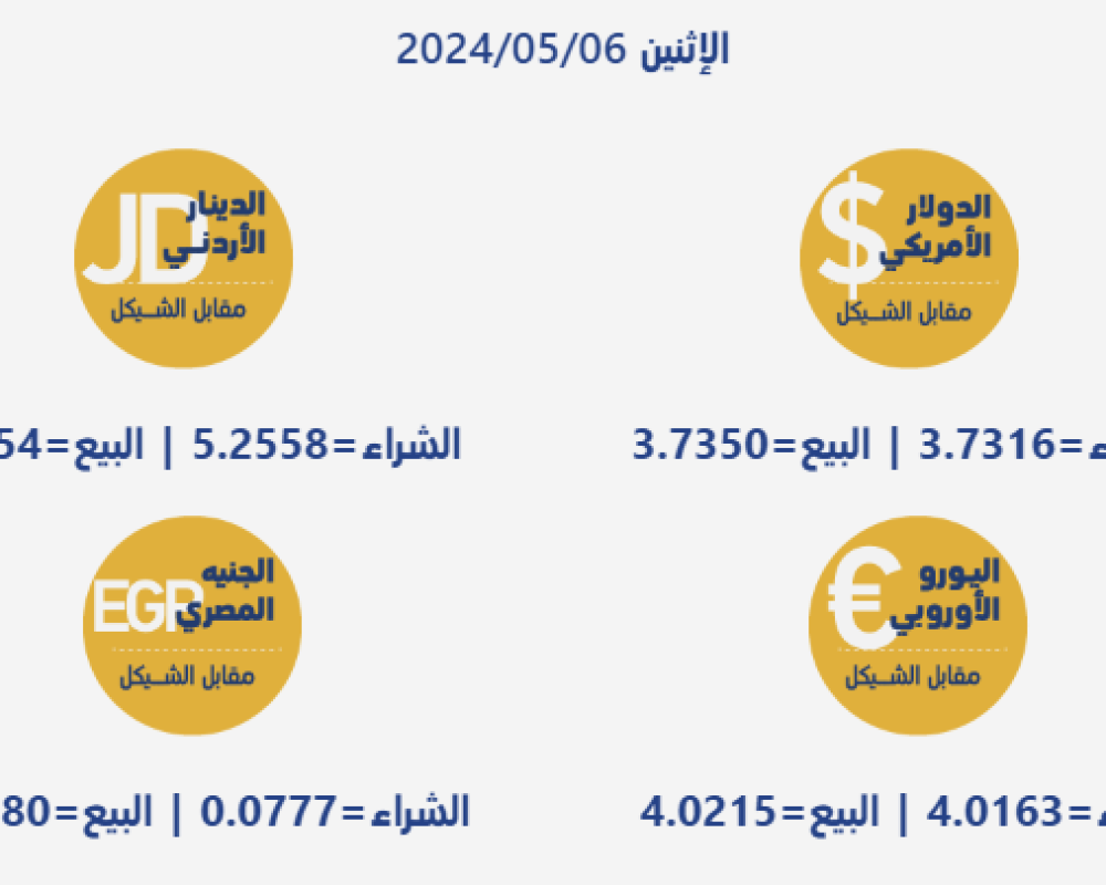رام الله/PNN- جاءت أسعار صرف العملات مقابل الشيقل الإسرائيلي، اليوم الإثنين، بحسب سلطة النقد الفلسطينية، على النحو التالي: