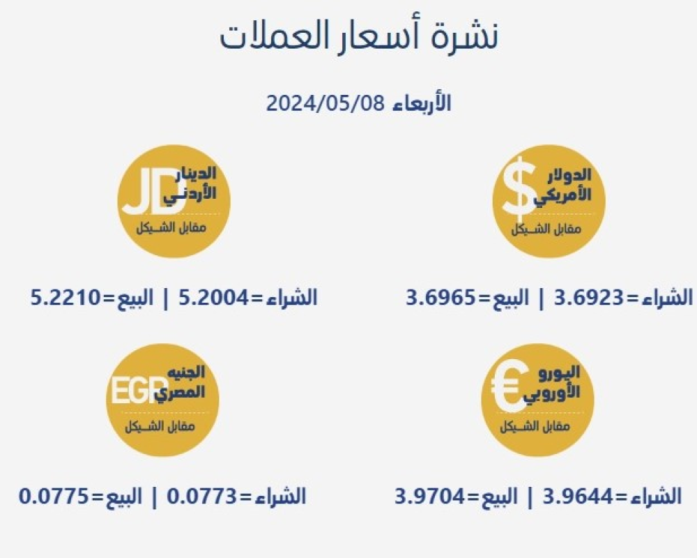 رام الله/PNN- جاءت أسعار صرف العملات مقابل الشيقل الإسرائيلي، اليوم الأربعاء، بحسب سلطة النقد الفلسطينية، على النحو التالي: