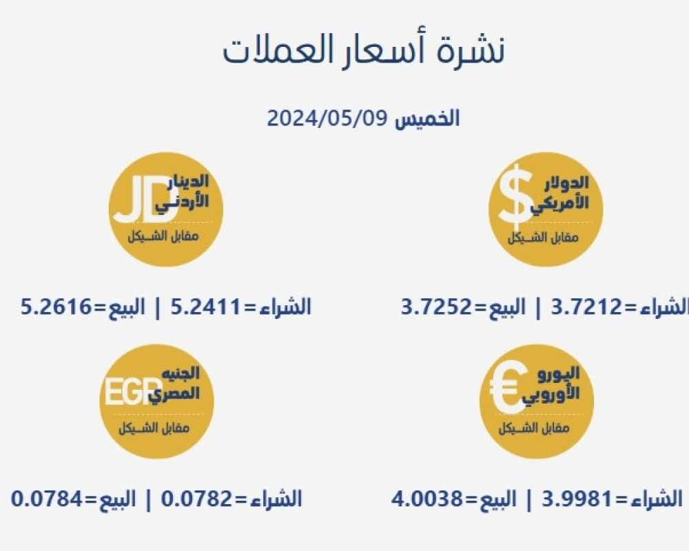 رام الله/PNN- جاءت أسعار صرف العملات مقابل الشيقل الإسرائيلي، اليوم الخميس، بحسب سلطة النقد الفلسطينية، على النحو التالي: