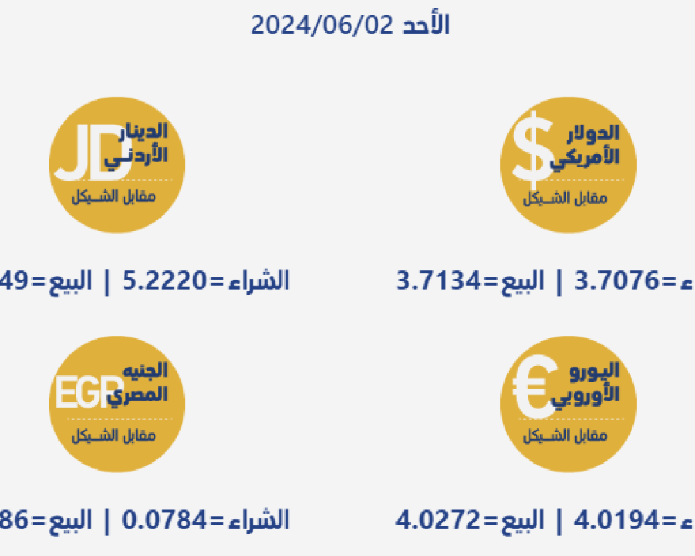 رام الله/PNN- جاءت أسعار صرف العملات مقابل الشيقل الإسرائيلي، اليوم الأحد، بحسب سلطة النقد الفلسطينية، على النحو التالي: