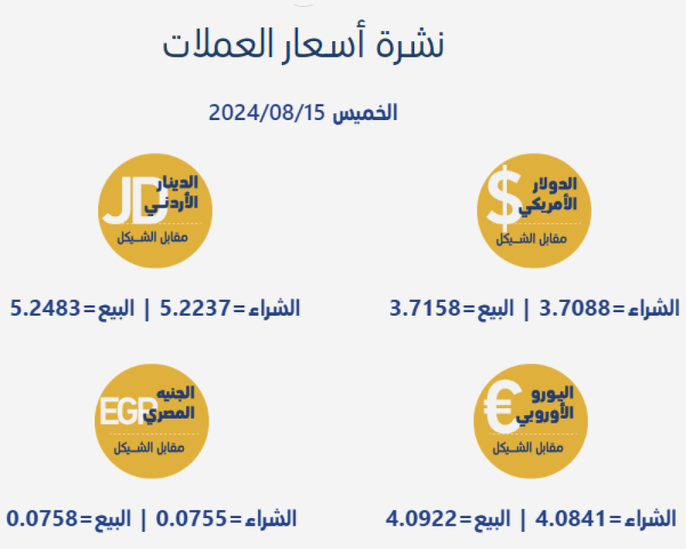 رام الله/PNN- جاءت أسعار صرف العملات مقابل الشيقل، اليوم الخميس، بحسب سلطة النقد الفلسطينية، على النحو التالي:
