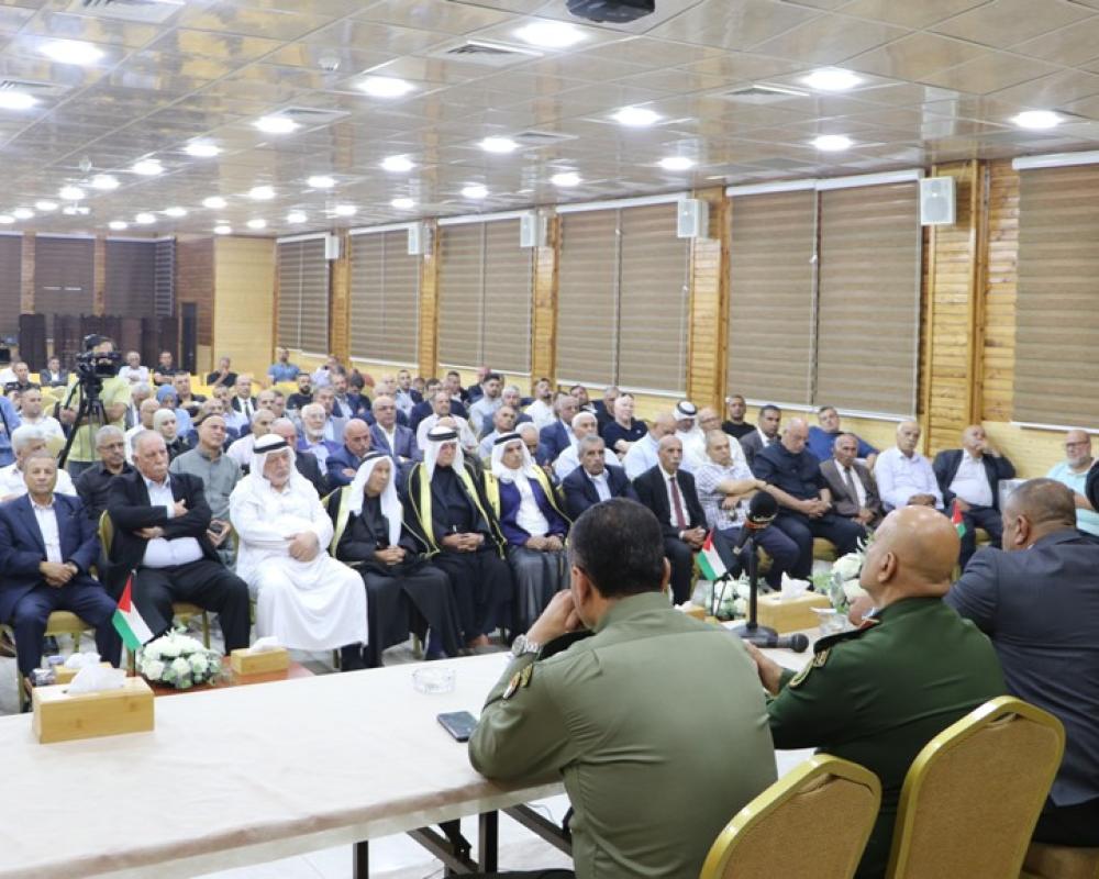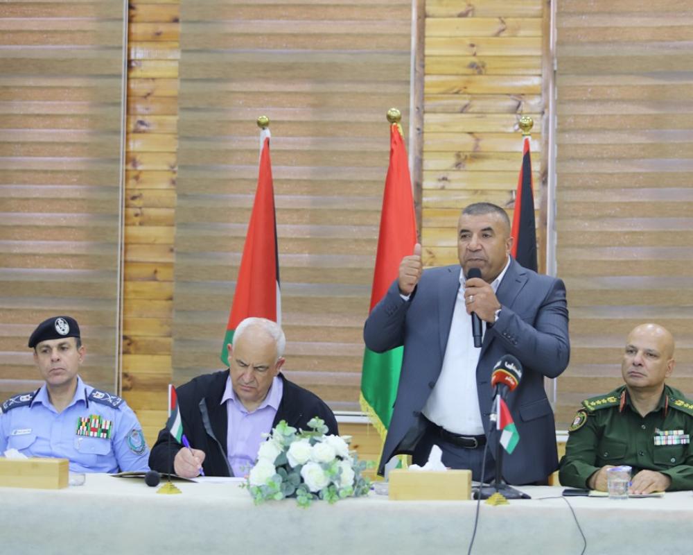 ومن ثم ترأس معالي وزير الداخلية والمحافظ دودين واللواء السقا اجتماعا موسعا ضم وجهاء وفعاليات المحافظة تحدث خلاله اللواء هب الريح عن الجهود التي تبذلها المؤسسة الأمنية لملاحقة كافة الخارجين عن القانون والإجراءات التي سيتم اتخاذها ميدانيا للحفاظ على الكينونة الفلسطينية ومقدرات الشعب من خلال الثبات على المواقف الوطنية وأضاف انه سيتم ملاحقة العصابات والخارجين عن القانون والتعامل معهم بكل حزم وفق القانون .