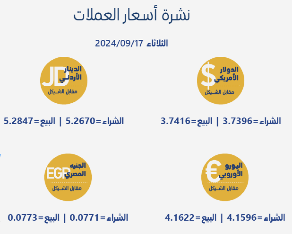 رام الله/PNN- جاءت أسعار صرف العملات مقابل الشيقل، اليوم الثلاثاء، بحسب سلطة النقد الفلسطينية، على النحو التالي: