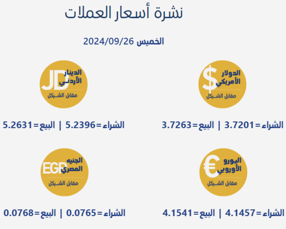 رام الله/PNN- جاءت أسعار صرف العملات مقابل الشيقل الإسرائيلي، اليوم الخميس، بحسب سلطة النقد الفلسطينية، على النحو التالي: