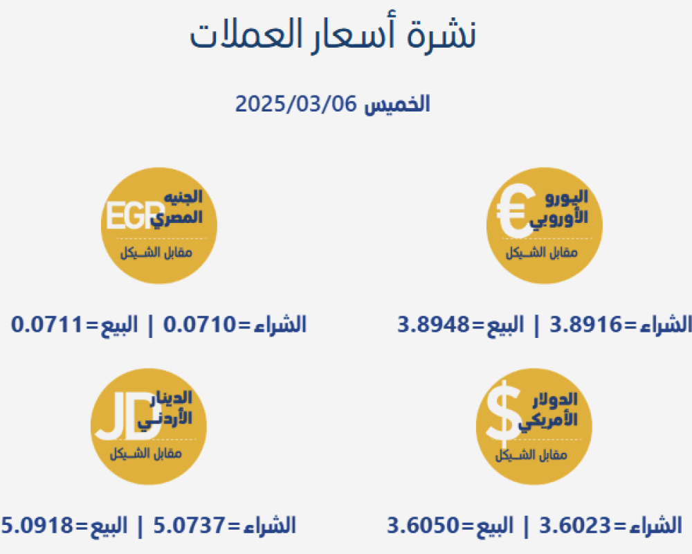 رام الله -PNN- جاءت أسعار صرف العملات مقابل الشيقل الإسرائيلي، اليوم الخميس، بحسب سلطة النقد الفلسطينية، على النحو التالي: