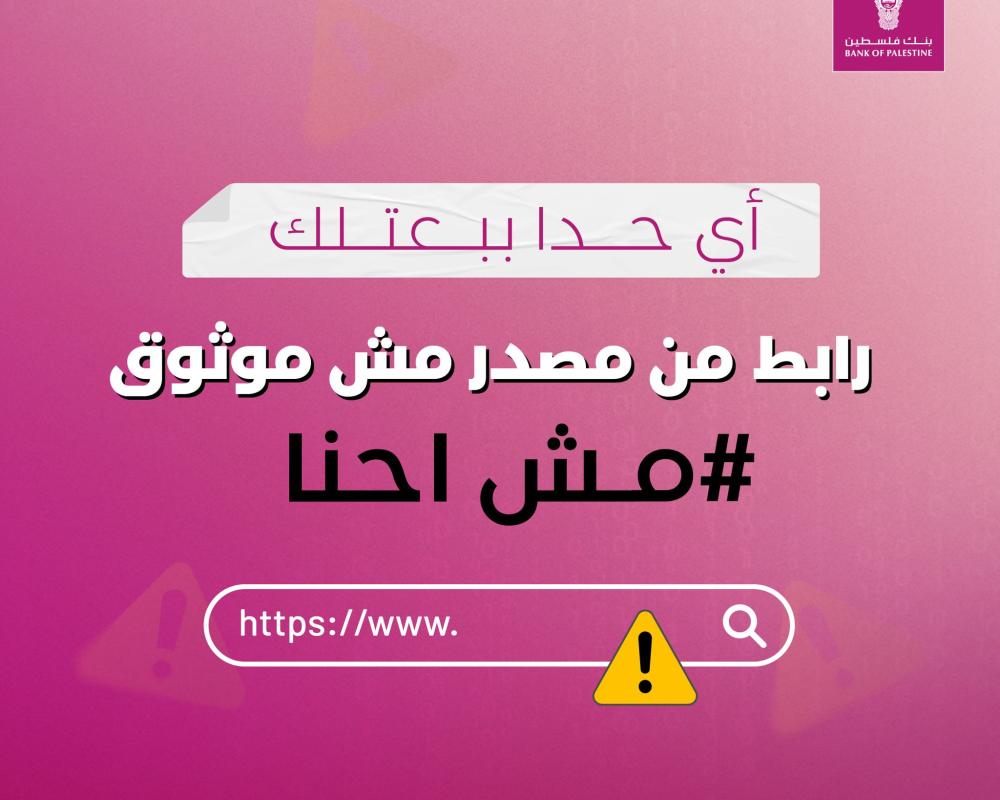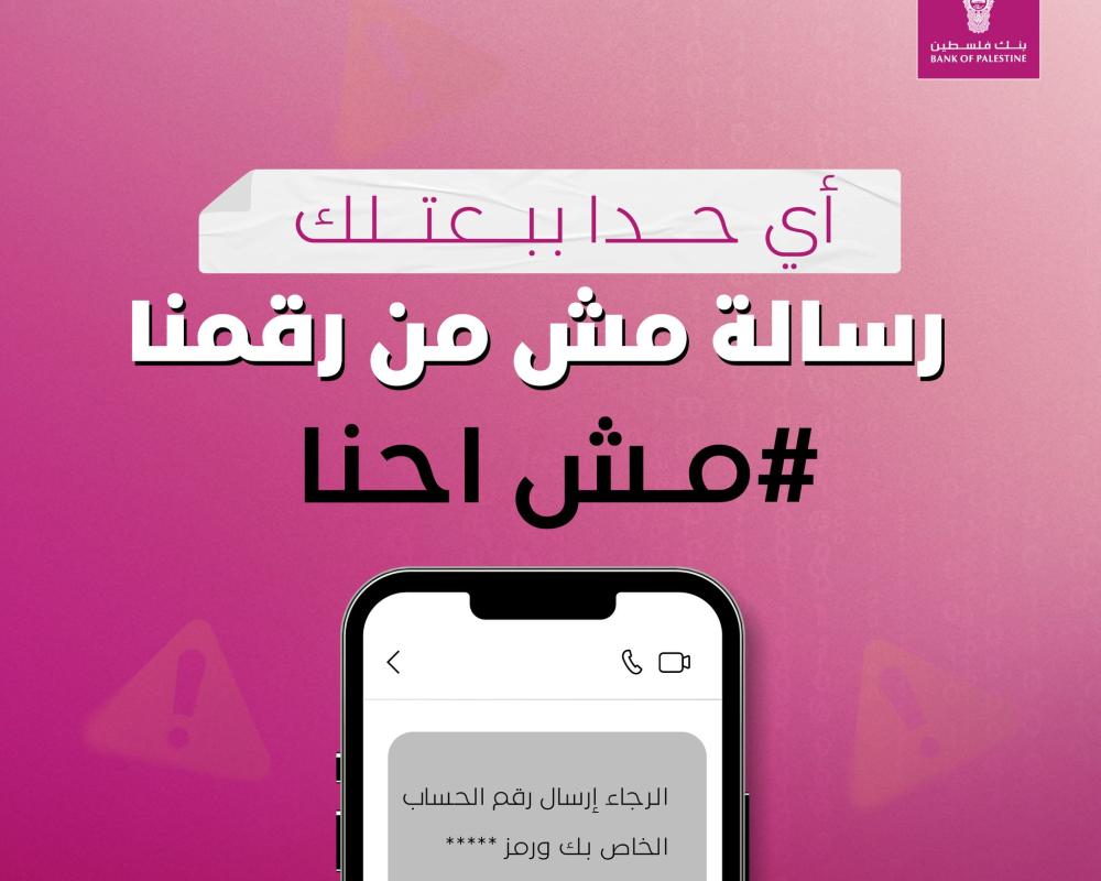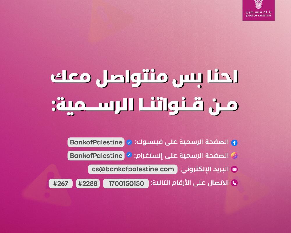 رام الله /PNN / حذر بنك فلسطين مساء الأربعاء 9 أبريل 2025 ، المواطنين الفلسطينيين من عمليات نصب واحتيال الكترونية من جهات مشبوهة ومجهولة.