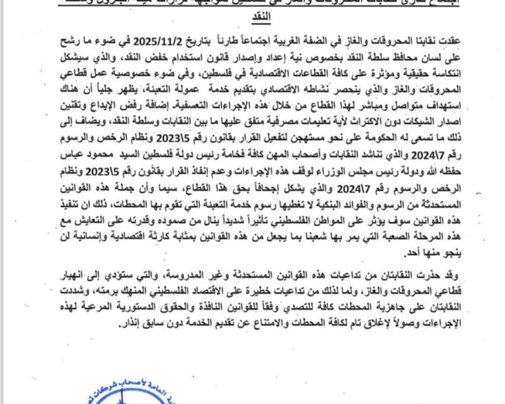 وطالبت النقابات الرئيس محمود عباس ورئيس مجلس الوزراء بالتدخل العاجل لوقف العمل بالقرارات رقم (2024/7) و(2023/15) الصادرة عن هيئة البترول وسلطة النقد، مشددة على أن استمرار تطبيقها سيؤدي إلى "انهيار قطاع المحروقات والغاز بشكل كامل" وانعكاسات اقتصادية وإنسانية خطيرة على المواطنين.