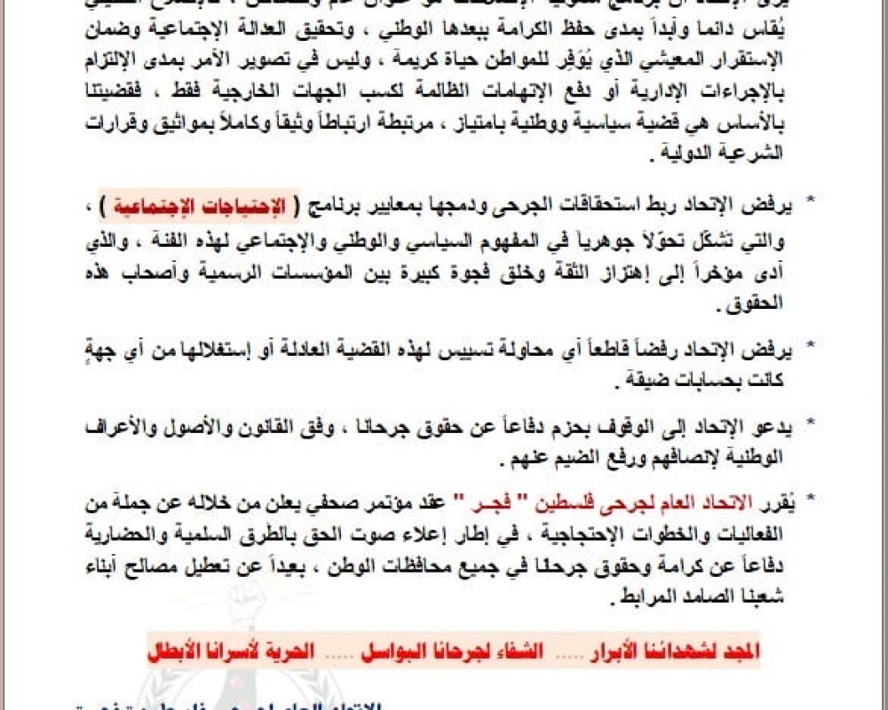 وطالب الاتحاد بإطلاق حملة سياسية وقانونية دولية للتأكيد على أن الجرحى الفلسطينيين هم ضحايا حروب وفق القانون الدولي، رافضاً في الوقت نفسه ربط استحقاقاتهم بمعايير “الاحتياجات الاجتماعية”، معتبراً أن ذلك يُفرغ قضيتهم من بعدها الوطني والسياسي.