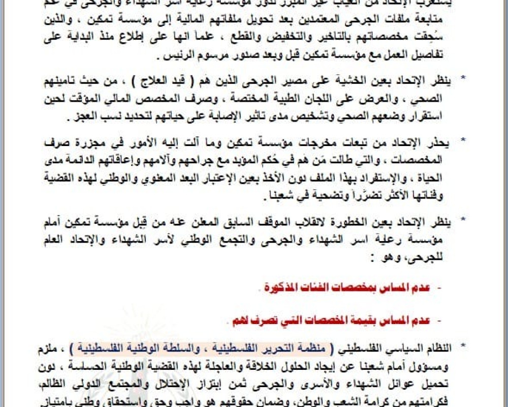 وانتقد الاتحاد ما اعتبره غياباً غير مبرر لدور مؤسسة رعاية أسر الشهداء والجرحى في متابعة ملفات الجرحى بعد تحويلها مالياً إلى مؤسسة تمكين، لافتاً إلى أن مخصصات عدد كبير من الجرحى تأثرت بالتأخير والتخفيض أو القطع.