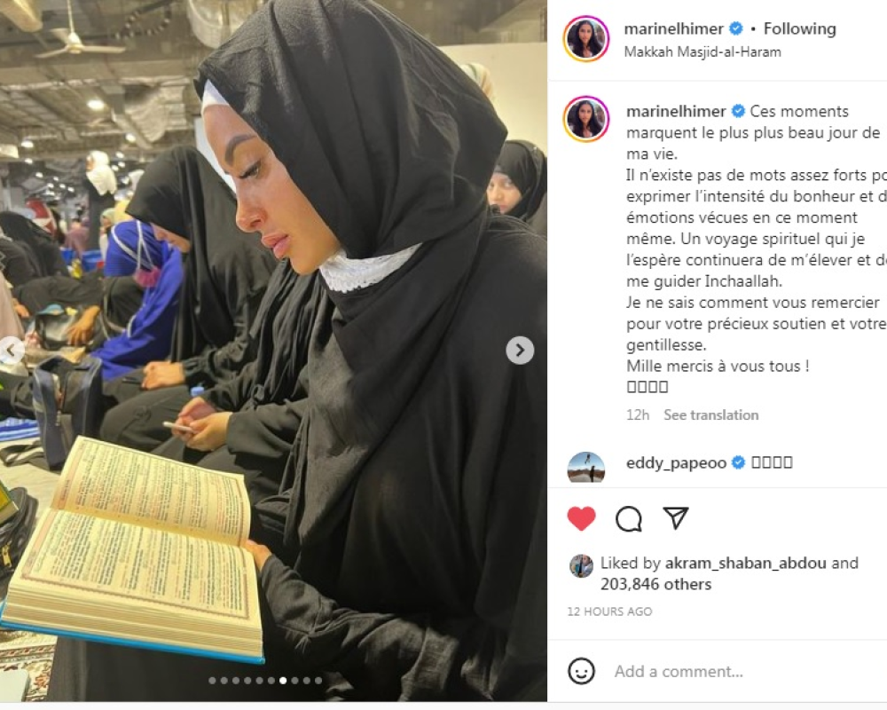 ونشرت مارين الحيمر مقطع فيديو على صفحتها في "إنستغرام"، التي يتابعها نحو 1.4 مليون متابع، حول اعتناقها الإسلام وتلقينها الشهادة، معلقة عليه بالقول: "هناك طرق يجب أن تسلكها بمفردك..لا أصدقاء ولا عائلة ولا شريك..فقط انت والله".