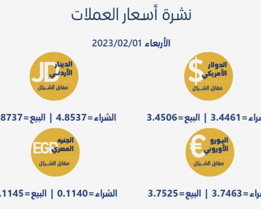 رام الله/PNN- جاءت أسعار العملات مقابل الشيقل الإسرائيلي، اليوم الأربعاء، حسب سلطة النقد، على النحو التالي: