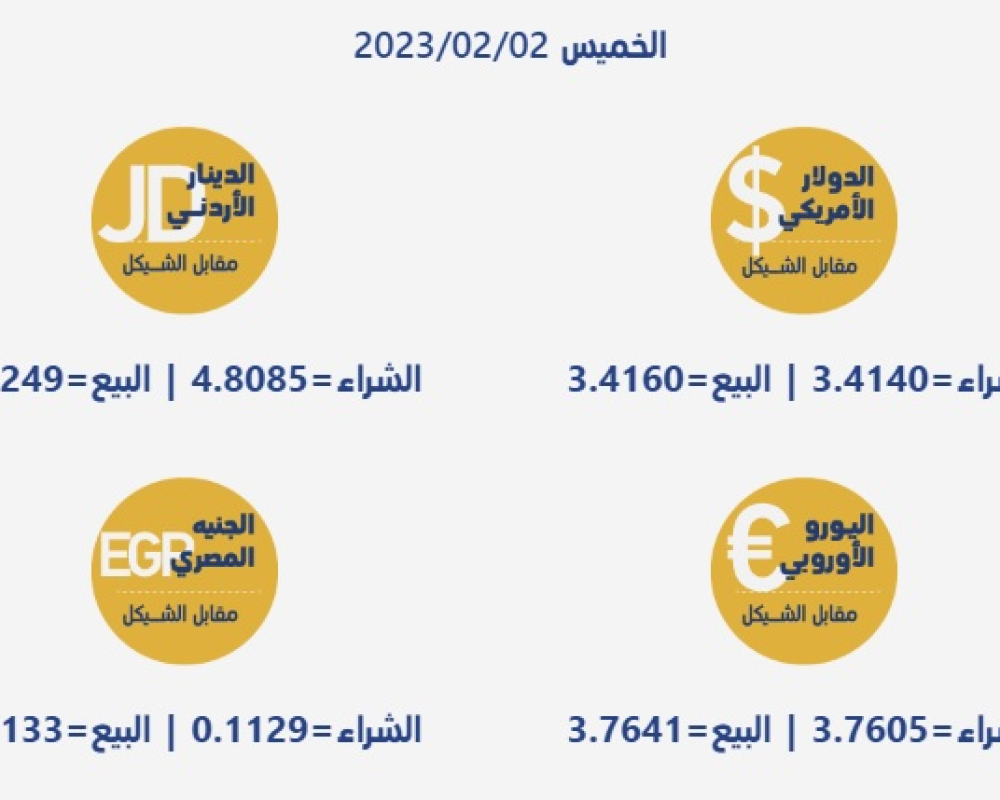 رام الله/PNN- أسعار العملات مقابل الشيقل الإسرائيلي، اليوم الخميس، حسب سلطة النقد، على النحو التالي: