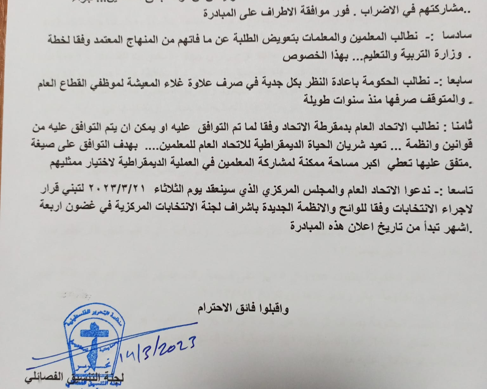 وطالبت الفصائل الحكومة باعادة الخصومات لكل المعلمين وصرفها على راتب شهر اذار الذي سيتم صرفه في بداية شهر نيسان 2023 كما طالبت الحكومة بتثبيت علاوة ال 15% على قسيمة راتب الشهر الحالي التي كان متفق عليها بين الاتحاد والحكومة باثر رجعي بدءا من تاريخ 1/1/2023