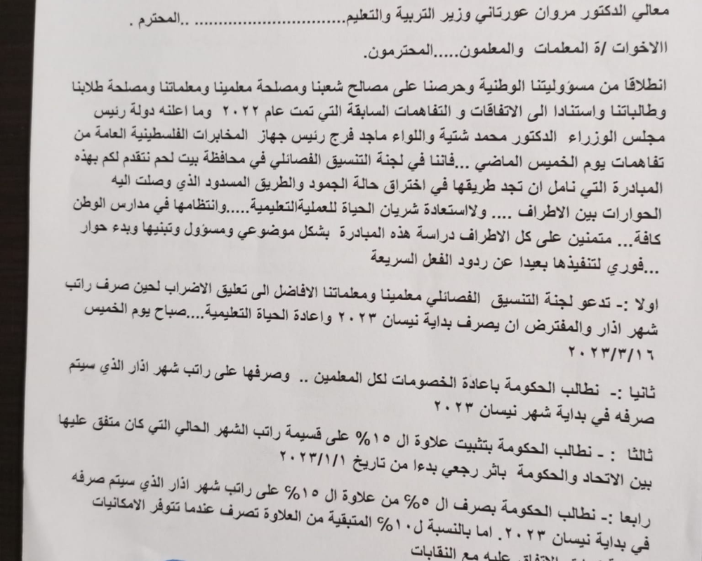 وتدعو المبادرة للجنة التنسيق الفصائلي معلمينا ومعلماتنا الافاضل الى تعليق الاضراب لحين صرف راتب شهر اذار والمفترض ان يصرف بداية نيسان 2023 واعادة الحياة التعليمية صباح يوم غد الخميس 16/3/2023